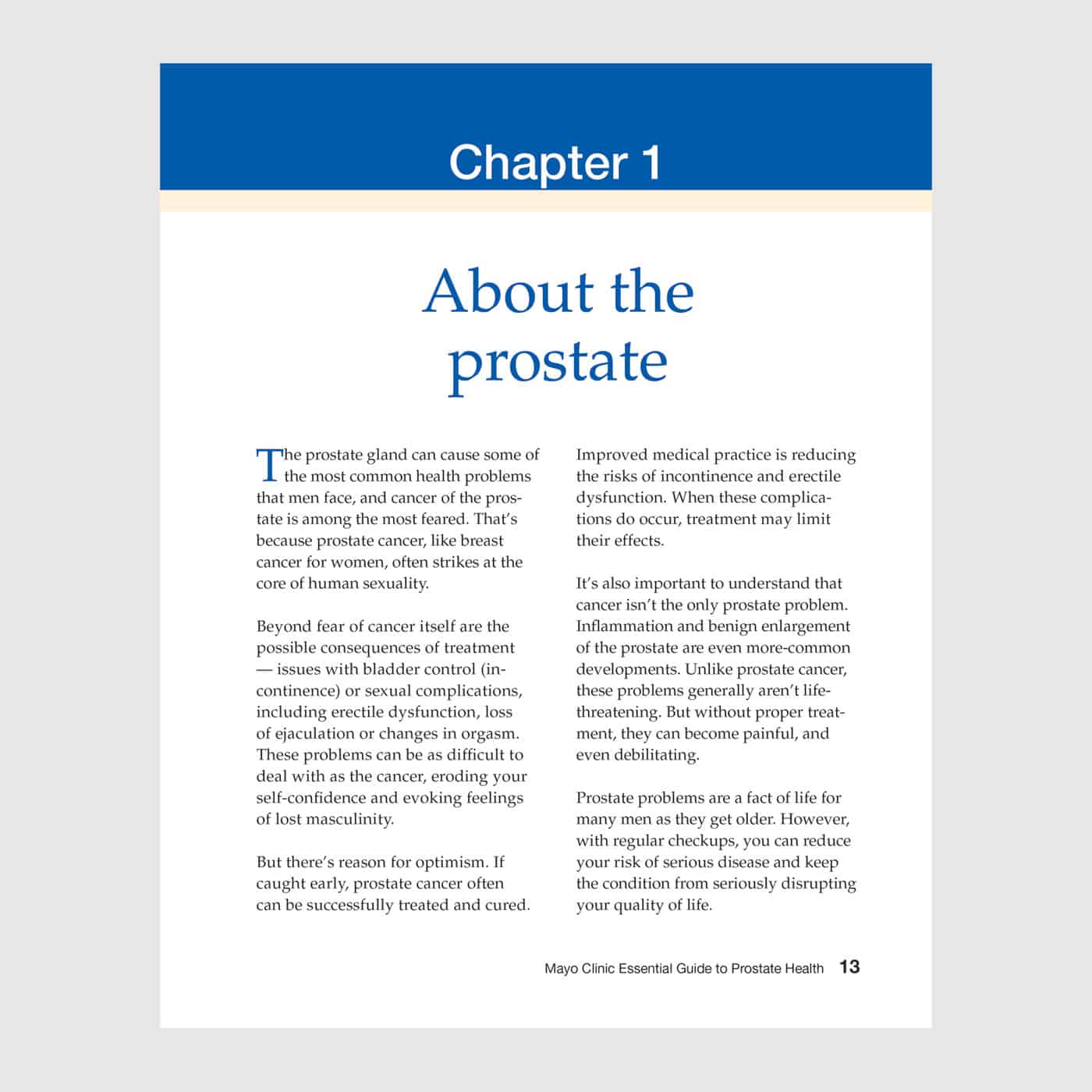 The most common forms of prostate disease, including prostate cancer, are often easily treated. Mayo Clinic Essential Guide to Prostate Health, Second Edition, an essential resource for every man, explains how to maintain better prostate health, and how to evaluate treatment options. The outlook for management, cure and survival of these diseases is better now than ever before. Prostate concerns often start out with changes in patterns of urination, difficulty with sexual function, or concern over hormonal levels.